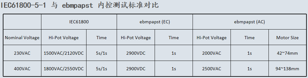 對于客戶端耐壓測試,由于ebmpapst都會對風(fēng)機(jī)進(jìn)行出廠耐壓測試,故客戶端重復(fù)耐高壓測試,安規(guī)里明確注明重復(fù)耐壓測試需要降低電壓值,一般取80%,1s。對于做大于1s的重復(fù)耐壓測試之后的產(chǎn)品絕緣性已經(jīng)遭受破壞,ebmpapst強(qiáng)烈建議不能出廠銷售。